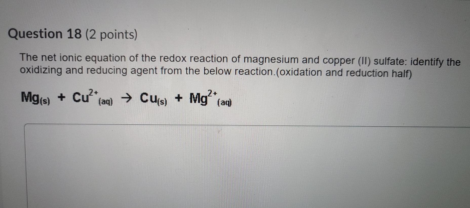 Question 18 2 points The net ionic equation of the redox reaction of magnesium and copper II sulfate. Mg sCu2aq SO2- 4 aq Mg2aq SO2- 4 aq Cu s This gives the net ionic equation. Cu Mg2 Molecular equation of copper II sulfate sodium carbonate Net ionic equation.
